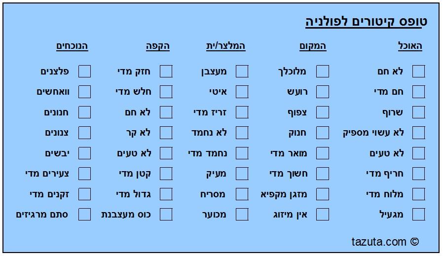 הכנתי טופס קיטורים, שאותו אניח לפניה ברגע שנגיע למקום הבילוי. במקום שהיא תבזבז אנרגיה לדקלם את רשימת הפגמים של המקום, שתוציא עט ותסמן X במקום המתאים בטופס. בלי מילים.